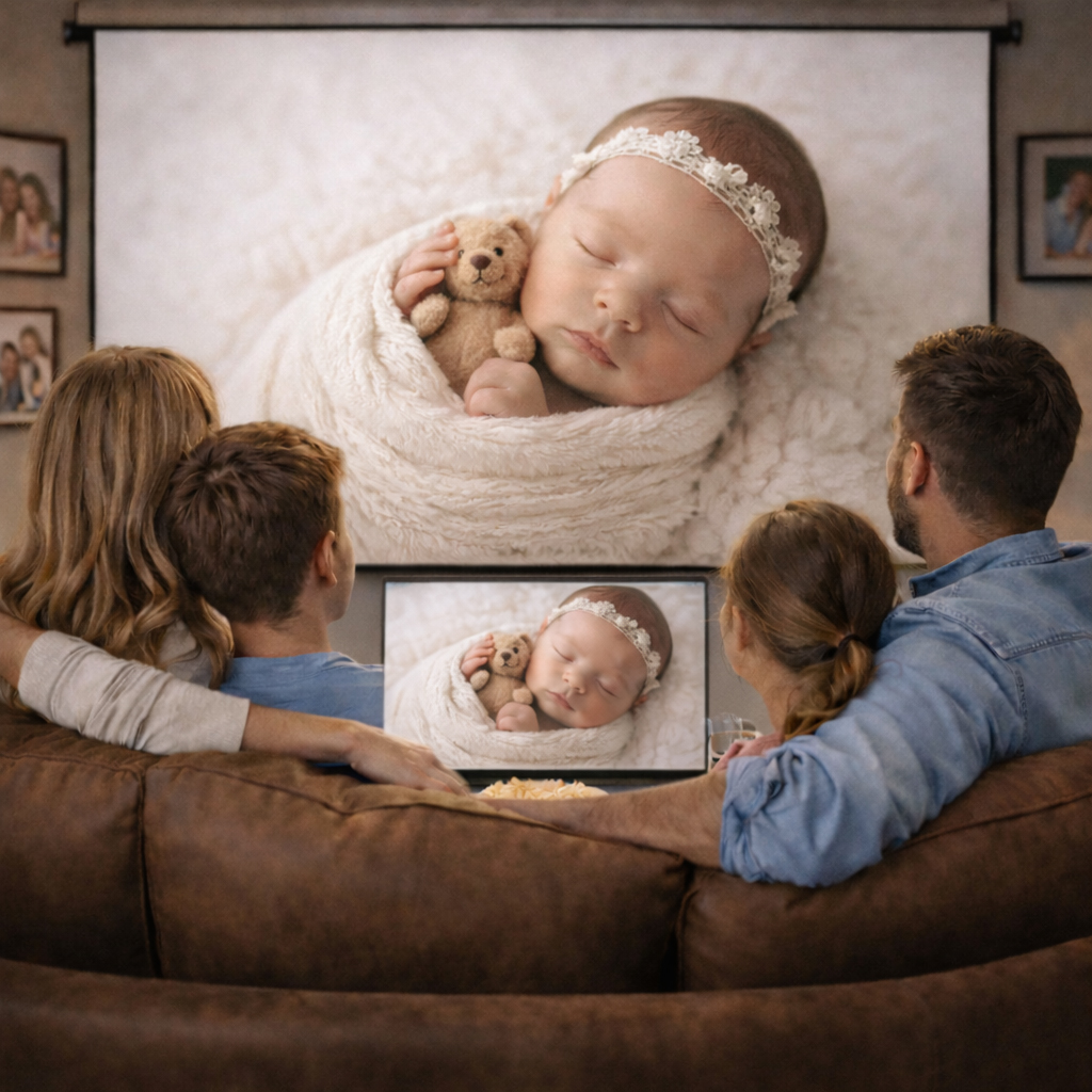 A beautiful, calm newborn photoshoot designed to capture your baby’s first days, with family and sibling portraits included. You’ll return to the studio for your private cinema viewing where you’ll choose your favourite images and design the artwork for your home.